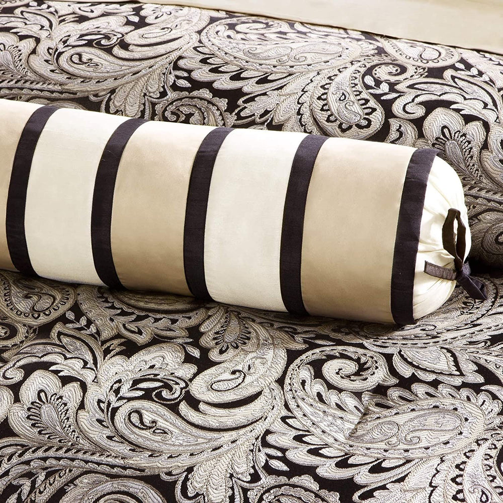 Give your mattress a magnificent makeover with this Queen 12 Piece Cotton Polyester Comforter Set Black Gold Paisley! Set includes 1 Comforter, 2 Decorative Pillows, 2 Euro Shams, 2 Standard Shams, 1 Bed skirt, 1 Flat Sheet, 1 Fitted Sheet, and 2 Pillowcases. Has a silky feel and is made from Polyester & Cotton. Set is in Queen size and ships via FedEx Ground.Size: QueenWhat's in the box: 1 Comforter, 2 Decorative Pillows, 2 Euro Shams, 2 Standard Shams, 1 Bed skirt, 1 Flat Sheet, 1 Fitted Sheet, 2 PillowcasesPattern: PaisleyMaterial: Polyester & CottonThread Count: 200Machine WashableDimensions: 90 inches L x 90 inches WWeight: 10 lbs