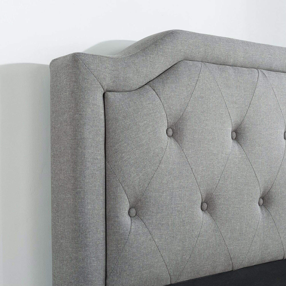 This King size Grey Upholstered Platform Bed with Classic Button Tufted Headboard will transform your bedroom. It ships in one carton with the frame, legs and wooden slats conveniently located in the zippered compartment in the back of the headboard for easy assembly. This classic platform bed features a scalloped headboard and low profile footboard style frame, with wood slats and exposed feet for support. The grey button tufted upholstery adds softness and provides a classic framework for your mattress.King size Grey Upholstered Platform Bed with Classic Button Tufted HeadboardClassic Scalloped Headboard styling and strong mattress supportSmartly packaged in one carton with the frame, legs, and wooden slats conveniently located in the zippered compartment in the back of the headboard for easy assemblyFoam padded tape is added to the steel frame for noise-free useMattress sold separatelyDimensions:80 x 76 x 38.1 inchesWeight: 97lbs.