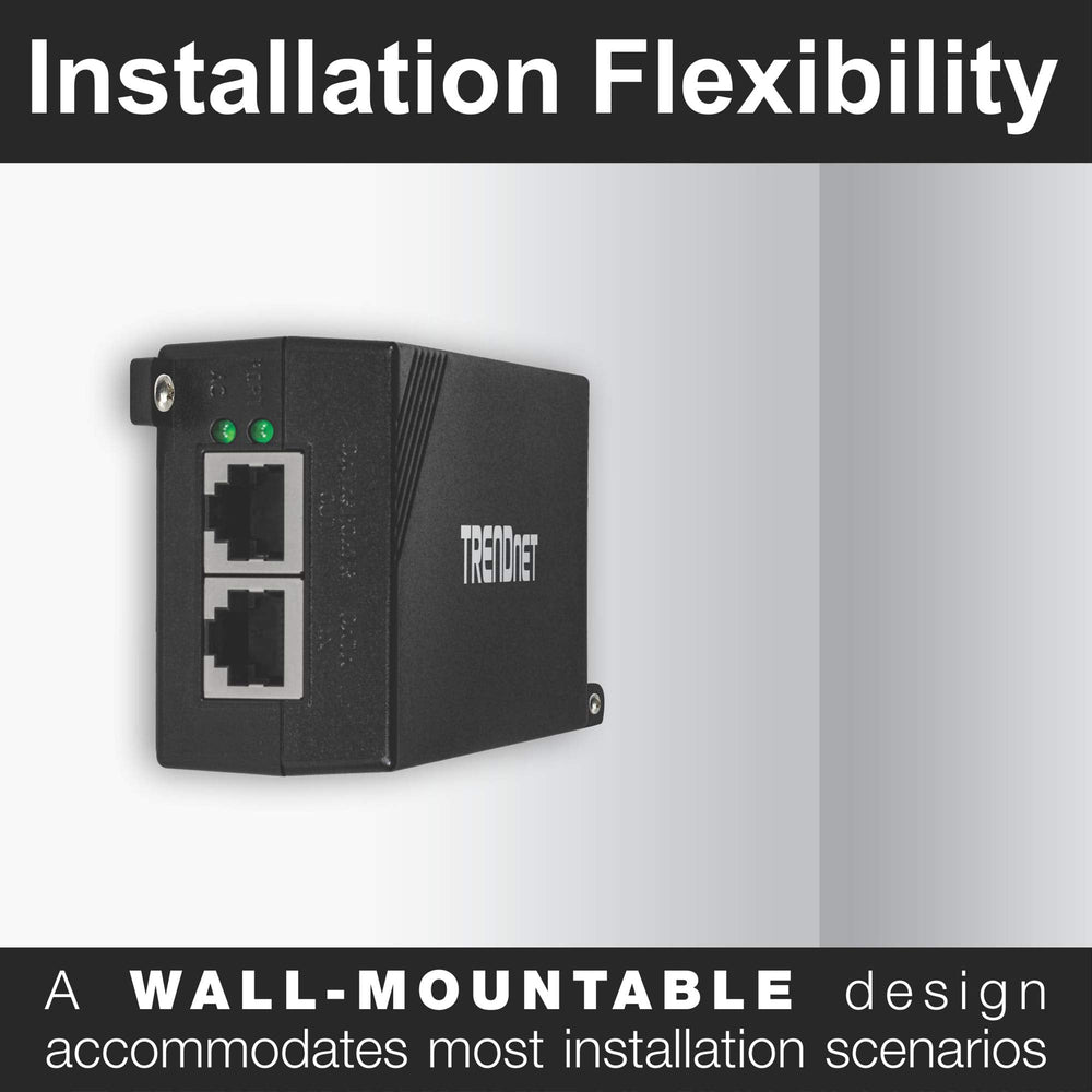 TRENDnets Gigabit PoE Injector, model TPE-115GI, combines electrical power with a Gigabit network connection to produce a Gigabit PoE signal. Auto-sensing technology conveniently delivers the correct wattage needed to power your PoE and PoE devices. Connect the injector to a non-PoE Gigabit switch and then run an Ethernet cable with data power to network a PoE or PoE device up to 100 meters (328 ft.) away. PoE Supplies a PoE device with PoE (15.4W) or PoE (30W) power. Installation Flexibility Wall-mountable design accommodates most installations scenarios. Gigabit SpeedsFull Duplex 2Gbps Ethernet speeds with this PoE injector. Package Contents:- TPE-115GI- Quick Installation Guide- Power cord