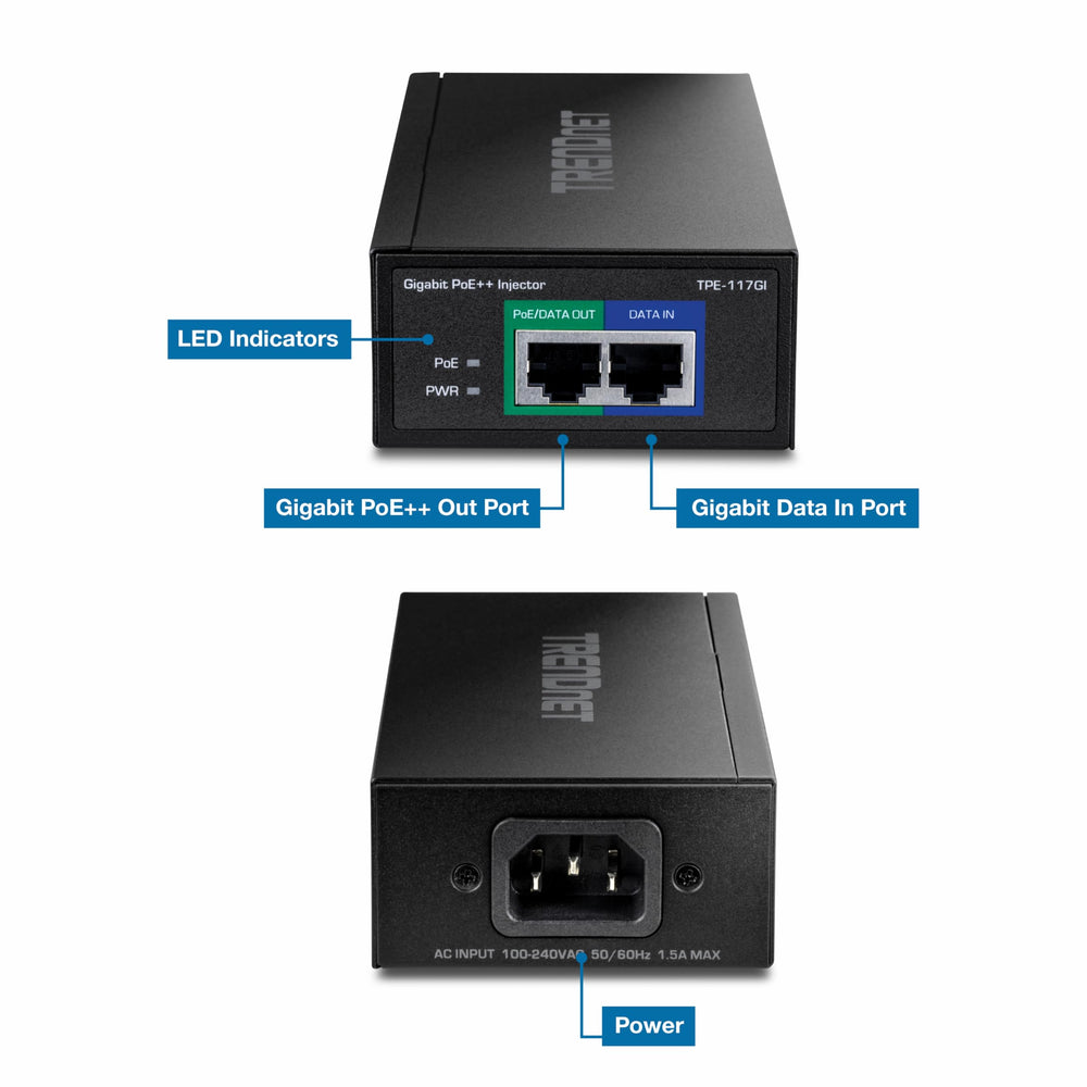 TRENDnet?? Gigabit 60W PoE Injector, model TPE-117GI, combines electrical power with a gigabit network connection to produce a gigabit PoE signal. Auto-sensing technology conveniently delivers the correct wattage needed to power your PoE devices. Use an existing open port from a non-PoE switch to save installation and equipment costs when installing PoE access points and IP cameras.