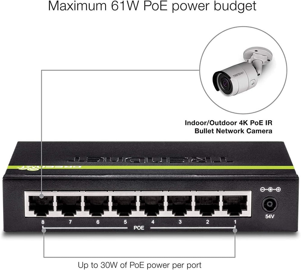 The 8-Port Gigabit PoE+ Switch, model TPE-TG82g, delivers data and power over existing Ethernet cables to Power over Ethernet (PoE) devices such as Access Points and IP Cameras. It supports both PoE and PoE+ devices with a 61W PoE budget. Plug and Play this sturdy metal switch for reliable high-speed PoE networking. PoE Power A 61W PoE power budget supports up to eight Power over Ethernet devices. Gigabit Ethernet Eight gigabit ports provide a 16Gbps switching capacity to support edge network installations. Compact Design With a compact and lightweight housing design, this switch is well-suited for desktop installations. Its fanless design is ideal for quiet environments that require silent operation.