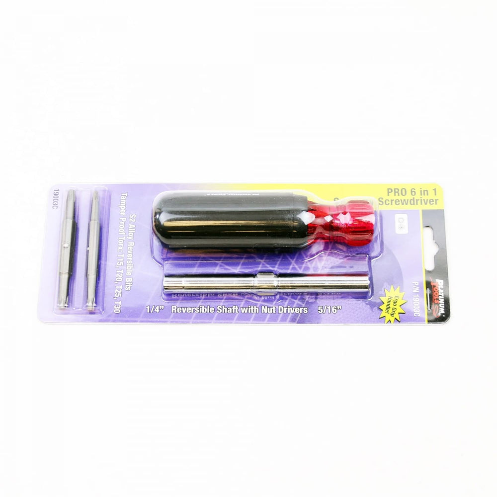 The Platinum 19003C 6-in-1 security screwdriver is ergonomically designed with a high impact plastic core in a comfortable cushion grip handle. These features allow the screwdriver to be used for an extended period of time without hand fatigue or stress. The 19003C comes with several screwdriver bits including Security Torx T15, T20, T25 and T30 and nut drivers for 1/4" and 5/16". Platinum Tools, founded in 1997, was created based upon two very simple objectives. First, develop, manufacture and source the absolute best possible solutions for preparation, installation and hand termination of wire and cable. Second, implement an operational infrastructure that can deliver these products in an efficient, timely and high quality manner. ??his item is not sold directly by Platinum Tools.??/p>