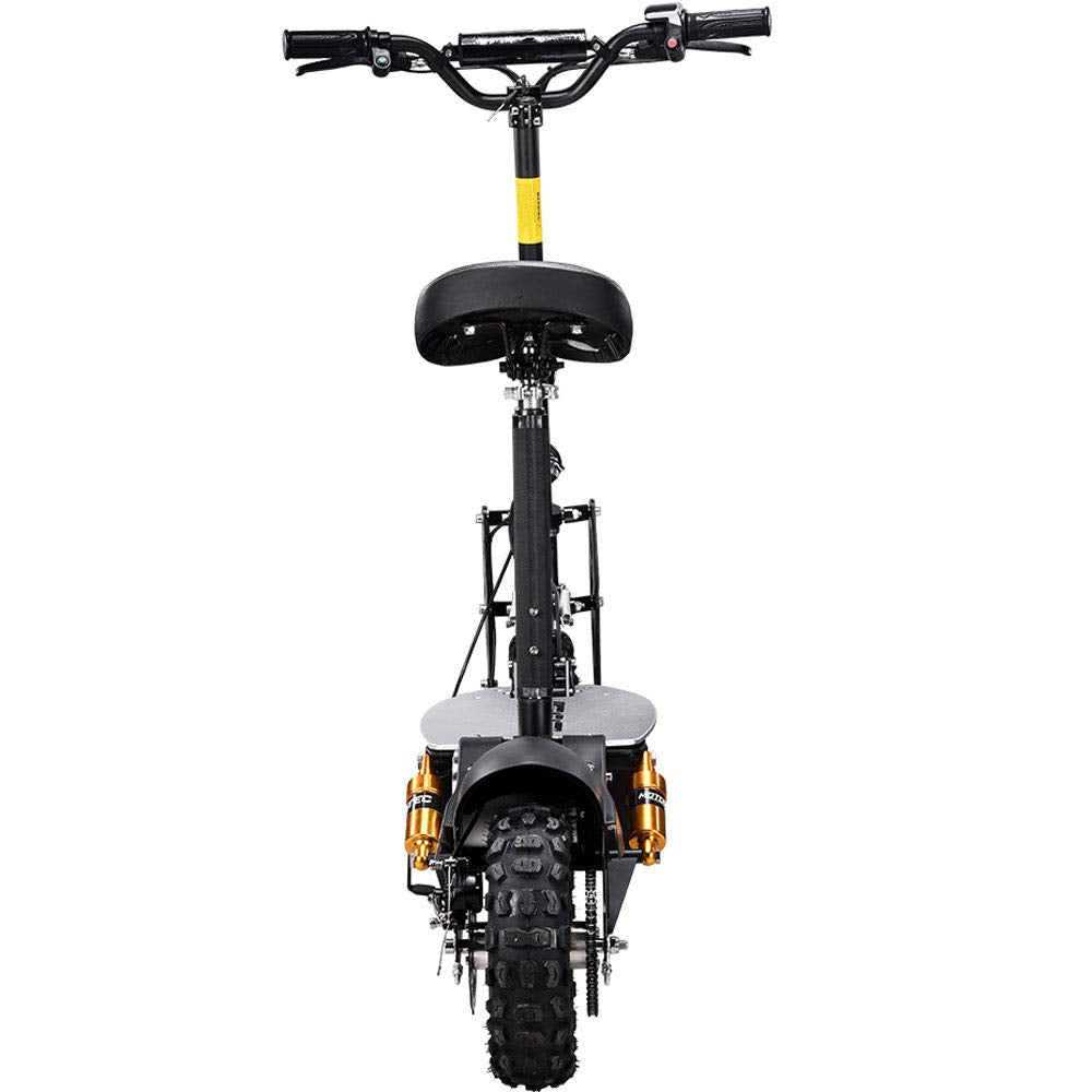 The MotoTec 2000 watt electric scooter is the most powerful electric scooter we carry. Powered by 48 Volts and a 2000 watt motor, there won't be a hill you can't conquer! Comes standard with a quick release seat, foldable locking frame, large 11 inch knobby on road/off-road tires, key ignition and ecomony mode to conserve battery life for longer rides. This scooter does not disappoint! Specs: drive system: chain motor: 2000 watt 48 volt (Brushless) batteries: four 12V/12Ah (48 volt system) sealed lead acid (SLA) battery life: 300 cycles economy mode: Yes (conserves battery power for longer rides) charger included: Yes horn: Yes foot deck: aluminum shocks: Yes (single front, dual rear) charging time: 6-8 hours brakes: front & rear disc tires/front: 11 inch pneumatic Knobby tire tires/rear: 11 inch pneumatic Knobby tire Max load: 285 lbs Max range: 10 to 20 miles per charge (weight dependant, terrain, economy mode selected etc.) Seat included: Yes, quick release foldable: Yes, Posi lock carton size: 48x13x20 inches 110 lbs Product size: Length 47 in, height 42 in, Width 26 in Product weight: 105 lbs folded dimensions: 46x25x21 inches