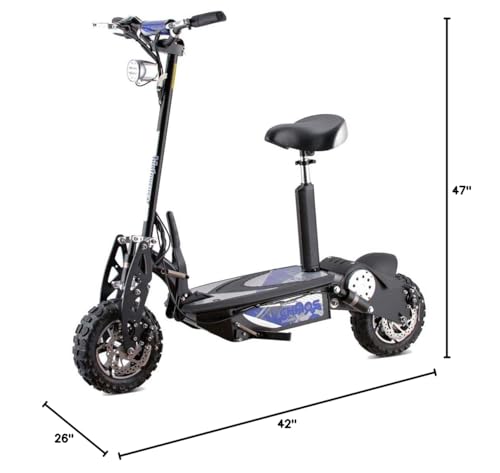 Introducing the MotoTec chaos electric scooter, the fastest scooter in MotoTec lineup, with impressive specs that do not disappoint! Powered by a 60 volt Lithium battery pack and a massive 2000 watt motor, there won't be a hill you can't conquer! Comes standard with a quick release seat, foldable locking frame, large 11 inch knobby on road/off-road tires, key ignition, headlight and economy mode to conserve battery life for longer rides. If you want the ultimate scooter in performance, speed and quality, This is the scooter for you. specs: drive system: chain motor: 2000 watt 60 volt (brushless)battery: 60V/15ah lithium-ion top speed: 32mph (weight dependent)battery life: 500 cycles economy mode: Yes (conserves battery power for longer rides)charger included: Yes> foot deck: ABS shocks: Yes (single front, dual rear)charging time: 6-8 hours brakes: front & rear disc tires/front: 11 inch pneumatic Knobby tire/rear: 11 inch pneumatic Knobby tiremax load: 265 lbs. max range: 15 to 30 miles per charge (weight dependent, terrain, economy mode selected etc. )foldable: Yes, Posi lock carton size: 47x13x19 inches product size: length 47 in, height 42 In, Width 26 in product weight: 85 lbs. folded dimensions: 46x25x21 inches: 60 days, parts replacement