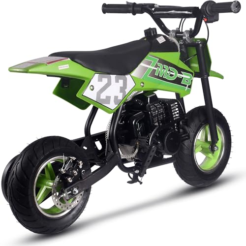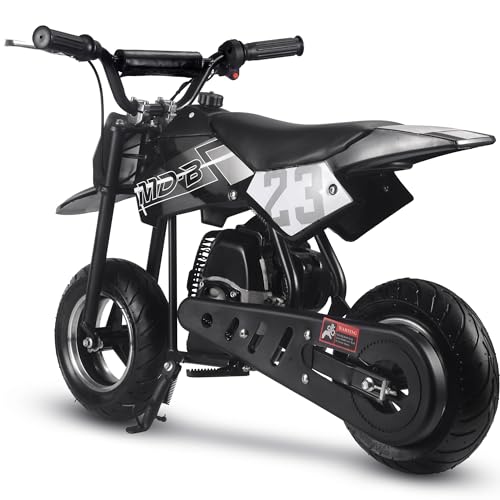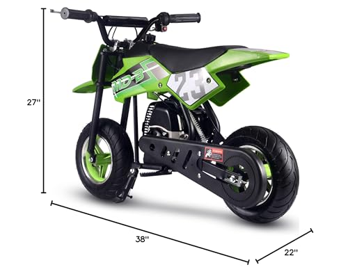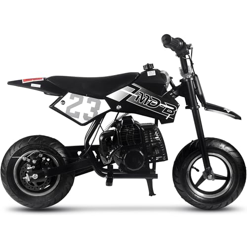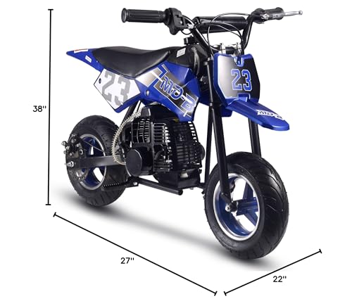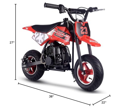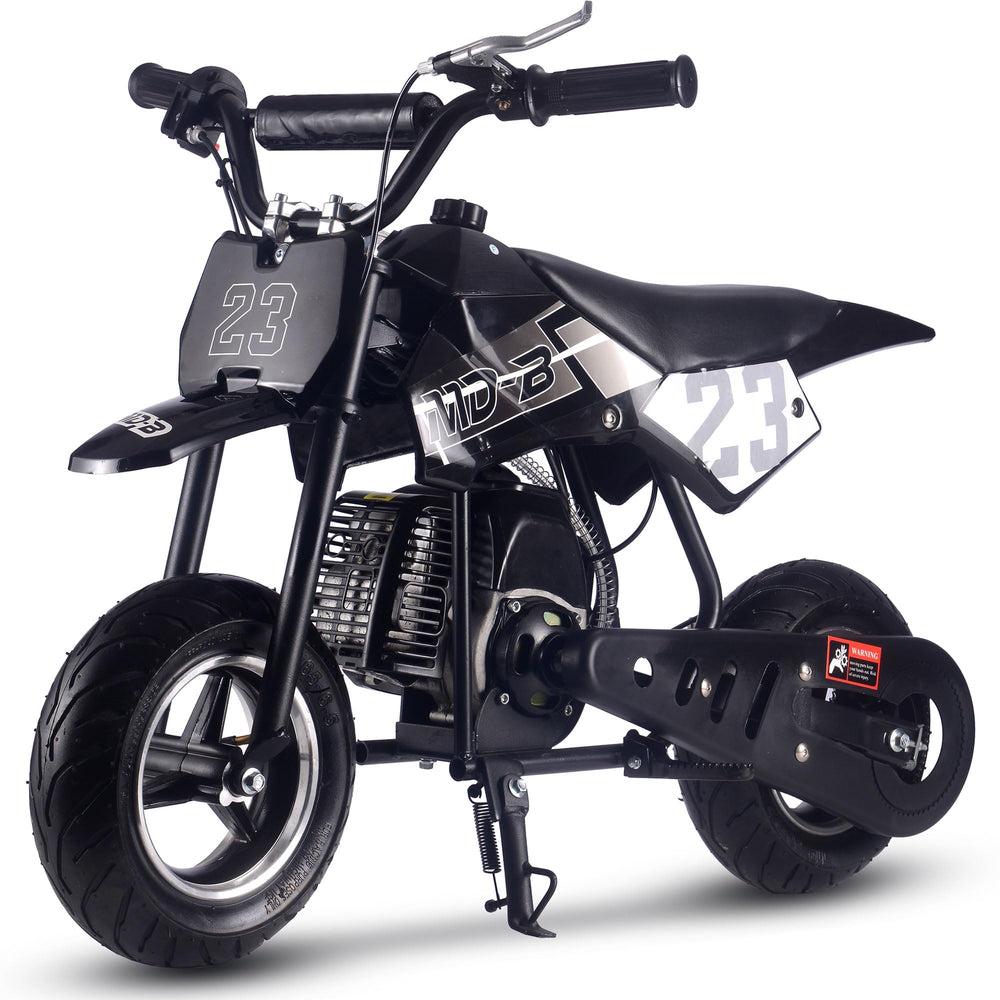 The MotoTec DB02 50cc Kids Supermoto Dirt Bike - The perfect kids starter dirt bike. The latest generation of 50cc mini bike engines are faster, torquier, more reliable and even easier to set up and start than ever before. 2-Stroke engines are preferred as they provide almost double the power of the same size 4-stroke. Easy pull start, improved carburetor and all of the standard safety features, support and reliability MotoTec provides. Suitable for both wet and dry conditions. This bike will offer hours of fun in almost any children? outdoor environment. Built Solid, this bike can handle most beginner terrain. A steel frame, with the ability to bear your child? weight as they grow, and real outdoor rubber tires separate this bike from similar products. Responsive acceleration, disk brake, motocross styling and big bike attitude, makes this the perfect children? choice. Simple to ride, it's fully automatic, so just twist the throttle and go. Specs: Motor: 50cc 2-Stroke, Air Cooled (EPA Approved) Gas/Oil Mixture: Unleaded 25:1 ratio Engine Start: Pull Start Gas Tank: 1 Liter Top Speed: 25 mph Cruising Range: 10+ miles per tank Max Rider Weight: 120 lbs Transmission: Auto Centrifugal Recommended Age: 13+ Max Rider Weight: 150 lbs Front Tires: 90/65-6.5 Rear Tires: 110/50-6.5 Brakes: Rear Disc Suspension: Ridgid Frame Wheelbase: 60 inches Throttle: Variable twist-grip Seat: Padded (single rider) Handlebars: Angle Adjustable, Not Height Seat Height from Ground: 21 inches Box Size: 35x13x22 inches Box Weight: 44 lbs Dirt Bike Dimensions: 38x22x27 inches Dirt Bike Dry Weight: 37 lbs Warranty: 30 days parts replacement