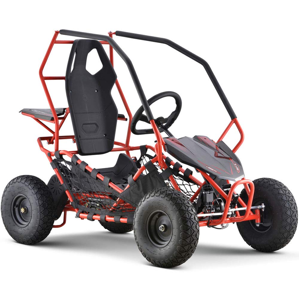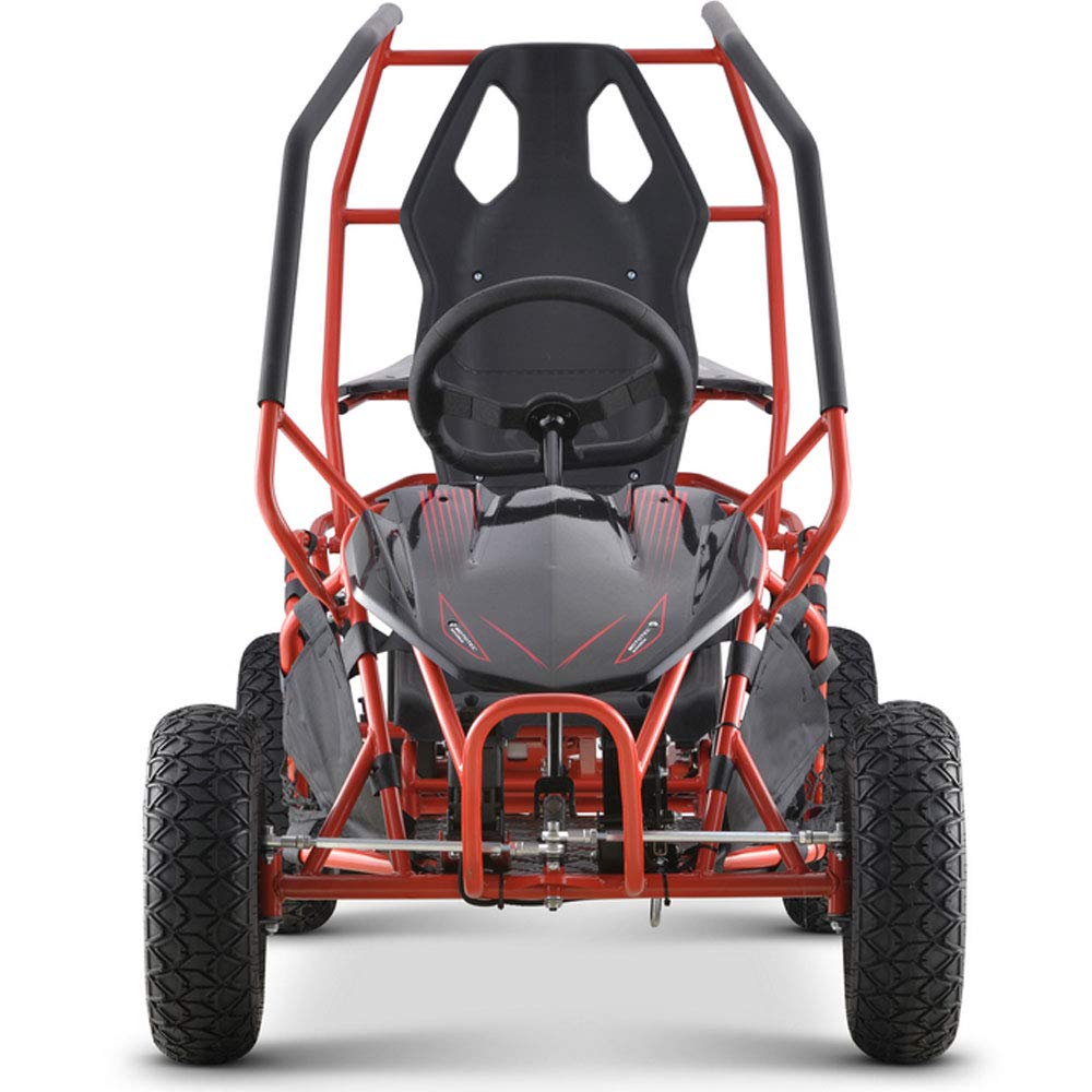 Introducing the new 36v 1000w Maverick Go Kart from MotoTec! Featuring a powerful 36 volt 1000 watt brushless motor, full roll cage safety bars, positraction, hydraulic rear brake, seat belt and most importantly, turf safe tires to help save your grass. This go kart is rugged and built to last. New features include: key start, battery meter, forward & reverse, 3 selectable speeds. Specs: Motor: 1000 Watt Peak 36 Volt (BRUSHLESS) Batteries: Three 12v/12ah Lead Acid Adjustable Speeds: 10mph, 15mph (20mph when optional plug is disconnected) Distance Per Charge: 5 to 12 miles (weight, terrain dependent) Reverse: Yes Charge time: 4 to 5 hours Ride time: Up to 40 minutes Max Rider Weight: 154lbs Distance from Back of Seat to Pedals: 80cm Distance from Back of Seat to Steering Wheel: 40cm Recommended Ride Height Min/Max:45in/63in Transmission: Chain Drive Throttle: Foot pedal Brake: Foot operated Hydraulic Rear Disc Parking brake: Yes Safety Features: Seat Belt, Full Roll Bar, Netting, Full chain guard Frame: High-Tensile Steel Tubular Wheels: 14x4.00-6 (6205-2z Bearing Size) Go Kart Size: 57x33x44 inches Go Kart Weight:150 lbs Box Size: 53x30x24 inches Box Weight: 181 lbs Warranty: 60 days parts replacement