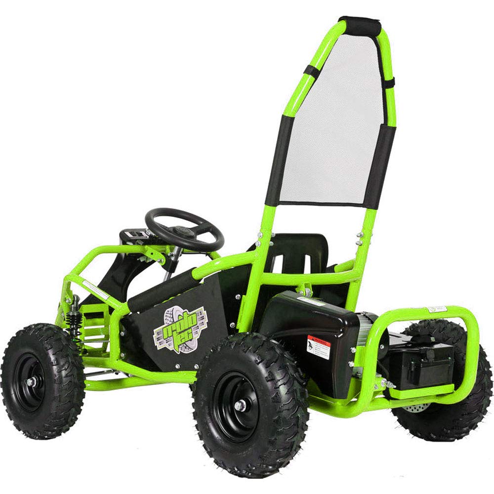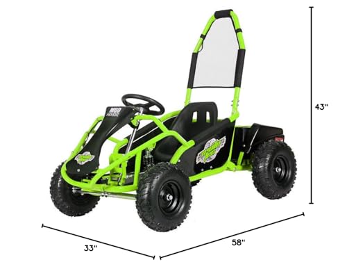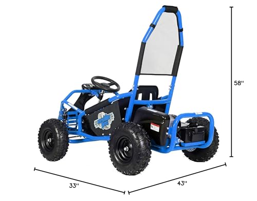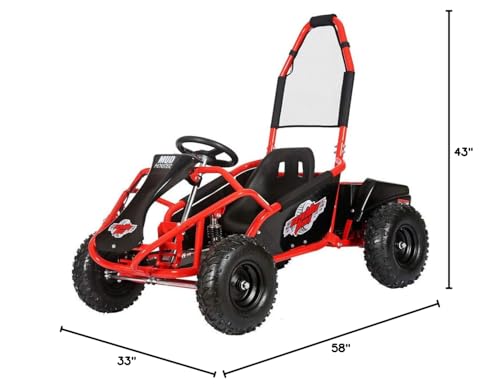 Introducing the new MotoTec Mud 48v 1000w Electric Kids Off Road Go Kart with Full Suspension! Featuring a powerful 48 volt 1000 watt motor, forward & reverse, two speeds, roll cage safety bar, positraction, metal throttle/brake pedals, adjustable seat, more leg room than the competition and seat belt. This go kart is rugged and built to last. Ride Safe: Always wear a helment and safety gear. Adult supervision is required. Specs: Motor: 48v 1000w (Permanent Magnet DC Brushless) Battery: Four 12v/12ah Sealed Lead Acid (48v 12ah Total) RPM: 5.8N.m/(2500+-100)r/min Recommended Age: 13 and up Max Rider Weight: 150 lbs Rider Height: Up to 63 inches fits comfortably (47 inch minimum) Top Speed: 10mph, 20mph Selectable Speed (weight dependent) Distance Per Charge: 5 to 20 miles (weight, terrain dependent) Forward & Reverse: Yes Transmission: Automatic, Centrifugal Clutch, Chain Drive Safety Features: Seat Belt, Roll Bar, Adjustable Seat and Kill Switch Suspension: Dual Front Hydraulic Shock, Single Rear Hydraulic Shock Minimum turning diameter: <=6m (22km/h) Frame: Steel Tubular Front Wheels: 14x4.10-6 Pneumatic Rear Wheels: 14x5-6 Pneumatic Brake: Foot operated Hydraulic Rear Disc Climbing Angle: 15 degrees Go Kart Weight: 192 lbs Go Kart Size: 58x33x43 inches Wheelbase: 36 inches Min Ground Clearance: 5 inches Box Weight: 236 lbs Box Size: 54x33x21 inches Warranty: 60 Day Parts Replacement