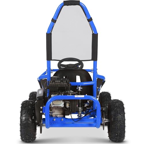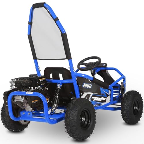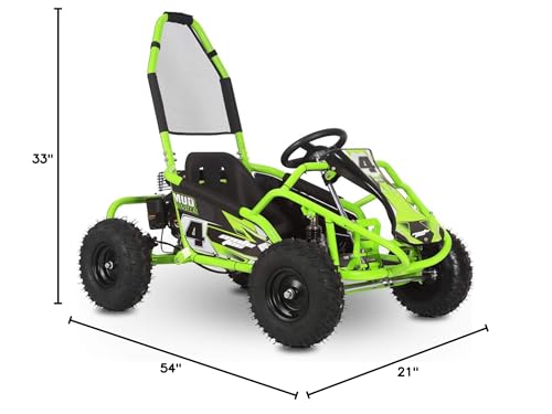 Introducing the new MotoTec Mud 98cc 4-stroke Kids Off Road Go Kart with Full Suspension! Featuring a powerful 98cc 4-Stroke OHV Engine, roll cage safety bar, metal throttle/brake pedals, adjustable seat, more leg room than the competition and seat belt. This go kart is rugged and built to last. Ride Safe: Always wear a helment and safety gear. Adult supervision is required. Specs: Engine: 98cc 4-Stroke OHV Spark Plug: F6TC Compression Ratio: 8.5:1 Power: 2.5 HP Bore/Stroke: 56mm/40mm Recommended Age: 13 and up Max Rider Weight: 150 lbs Rider Height: Up to 63 inches fits comfortably (47 inch minimum) Top Speed: 25mph (weight dependant) Transmission: Automatic, Centrifugal Clutch, Chain Drive Starting: Easy Pull Start Safety Features: Seat Belt, Roll Bar, Adjustable Seat and Kill Switch Suspension: Dual Front Hydraulic Shock, Single Rear Hydraulic Shock Minimum turning diameter: <=6m (22km/h) Frame: Steel Tubular Front Wheels: 14x4.10-6 Pneumatic Rear Wheels: 14x5-6 Pneumatic Brake: Foot operated Hydraulic Rear Disc Go Kart Weight: 155 lbs Go Kart Size: 58x33x43 inches Wheelbase: 36 inches Min Ground Clearance: 5 inches Box Weight: 198 lbs Box Size: 54x33x21 inches