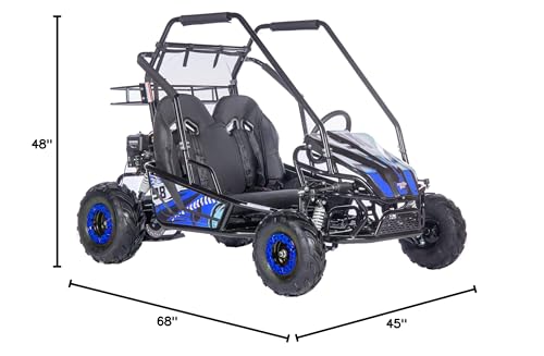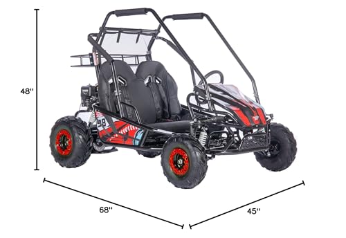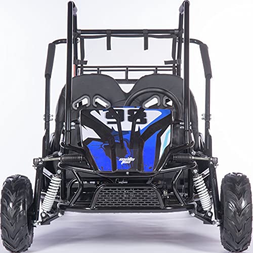 Introducing the new MotoTec Mud Monster XL 212cc 4-stroke 2 Seat Kids Off Road Go Kart with Front and Rear Suspension! Featuring a powerful 212cc 4-Stroke OHV Engine, padded roll cage safety bar, positraction, metal throttle/brake pedals, adjustable seat, more seating room than the competition and four-point safety harness. This go kart is rugged and built to last. Comes with easy pull start system, CVT torque converter, rear storage rack, low pressure tires for excellent grip and ride comfort. Ride Safe: Always wear a helmet and safety gear. Adult supervision is required. Specs: Engine: 212cc 4-Stroke OHV (EPA Approved) Spark Plug: F6TC Compression Ratio: 8.5:1 Max Power: 4.0KW/3600R/MIN Max Torque: 12NM/2500R/MIN Bore/Stroke: F70*55MM Recommended Age: 13+ Max Rider Weight: 400 lbs Recommended Max Rider Height: 67 inches Adjustable Seat: Yes Top Speed: 25mph Fuel Capacity: 3.6L Engine Oil Capacity: 0.6L Transmission: Automatic, Centrifugal Clutch, Chain Drive, CVT with BANDO Starting: Easy Pull Start Safety Features: 4-Point Seat Belt, Padded Roll Bar, Adjustable Seat and Kill Switch Suspension: Independent Front Hydraulic Shock, Dual Rear Hydraulic Shock Minimum turning diameter: 7 meters Frame: Steel Tubular Front Wheels: 145/70-6 Pneumatic Rear Wheels: 16x8-7 Pneumatic Brake: Foot Operated Hydraulic Rear Disc Go Kart Weight: 242 lbs Go Kart Size: 68x45x48 inches Wheelbase: 1250MM Min Ground Clearance: 80MM Box Weight: 276 lbs Box Size: 69x45x24 inches Warranty: 60 Day Parts Replacement