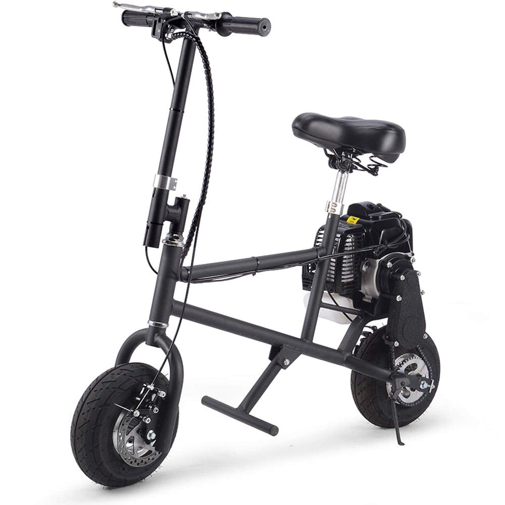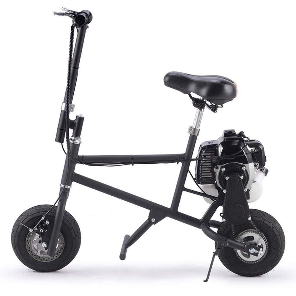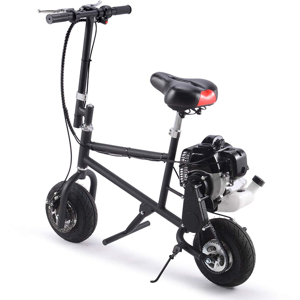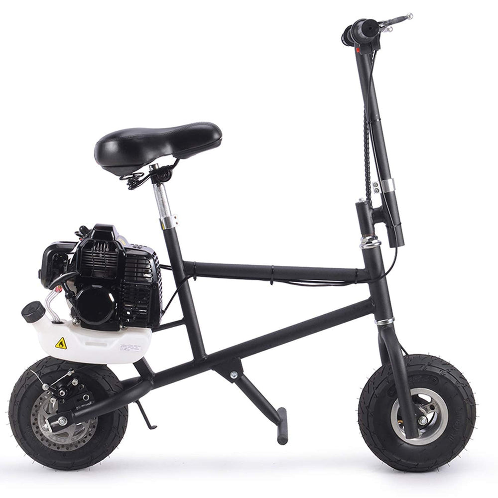 The MotoTec 49cc Gas Mini Bike is the ultimate kid ride! Great for driveway and parking lot fun, cruise around cones and speed through trails with ease. Comes standard with front & rear disc brakes and 10 inch pneumatic street tires. SAFETY FIRST - ALWAYS WEAR YOUR HELMET AND ALL SAFETY EQUIPMENT and observe safe riding rules!!! Specs: Motor: 49cc 2-Stroke, Air Cooled, EPA Approved Engine Start: Pull Start Gas Tank: 1 liter Cruising Range: 10-20 miles per tank Fuel/Oil: Unleaded / 2-stroke Oil 32:1 Transmission: Centrifugal (chain drive) Bike Size: L=39in, W=17in, H=38in Seat Height: 26in Chain: T8F 43 Link Recommended Age: 13 Max Rider Weight: 185 lbs Frame: Steel Front & Rear Tire: 3.00-4 (10 inch) Brakes: front & rear disc Frame: Ridged Steel Throttle: Variable twist-grip Seat: Padded (single rider) Assembly Required: Yes Box Size: 41x16x27 inches Box Weight: 58 lbs Product decoration and specifications subject to change without notice. Warranty: 30 days parts replacement