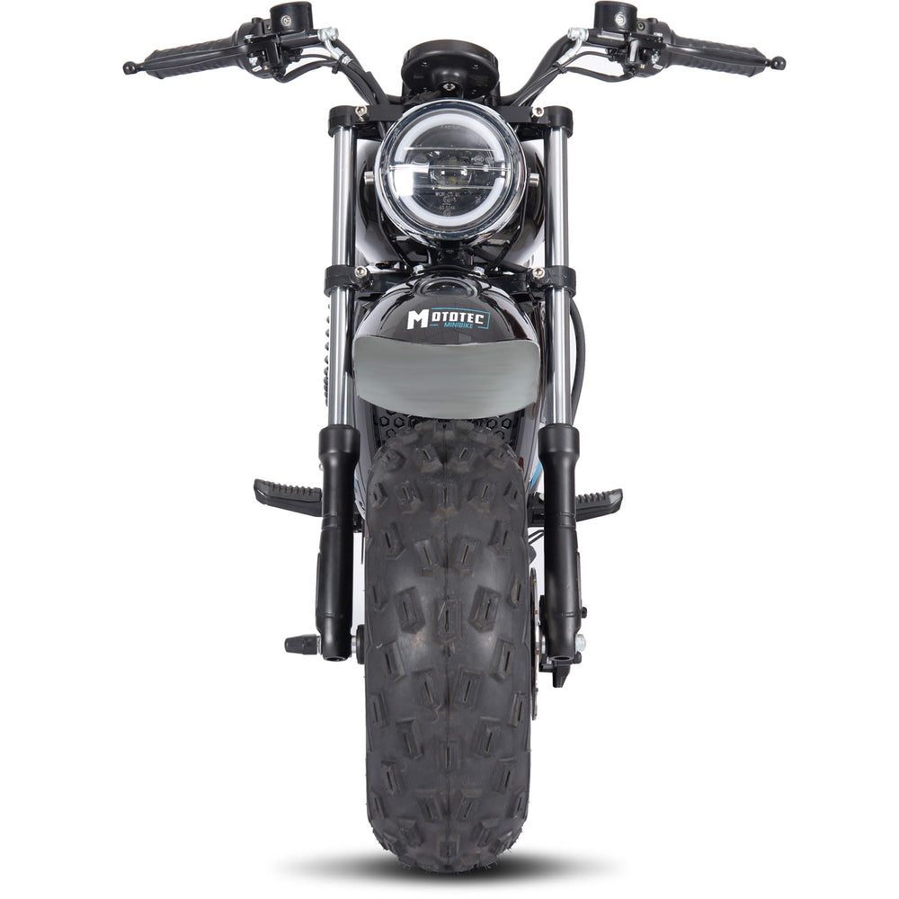 Introducing the MotoTec 60v 1500w Lithium Electirc Mini Bike! Just like the ones your parents used to drive, only safer and easier to use. Powered by a brushless 1500 watt electric hub motor, twist throttle for easy operation, large front headlight and key start. With it's rugged steel frame and huge knobby tires, this mini bike is built tough to handle the roughest of terrain. Motor: 60v 1500w (Hub Motor) Battery: 60v/20ah Lithium Ion Top Speed: 28mph Adjustable Speeds: 13mph, 18mph, 28mph (handlebar switch) Range per charge: 25 miles (weight dependent) Instrument Panel: LCD with Speedometer, Battery Meter, Trip Meter Keyed Storage Compartment (fake gas tank area) Charge Time: 10 hours (when fully drained) Throttle: Twist Key: Yes Frame: Steel Front & Rear Wheels: 18x7-8 pneumatic Brakes: Front & Rear Hydraulic Disc Suspension: Front & Rear Front Headlight: LED (High & Low Beam) Rear Brake Light: LED (Running light with Brake light) Horn: Yes Max Rider Weight: 220 lbs Seat Height: 26 inches Wheelbase: 42.5 inches Min Ground Clearance: 9 inches Box Weight: 176 lbs Box Size: 61x18x34 inches Mini Bike Weight: 119 lbs (without battery) Mini Bike Size: 61x29x33 inches Warranty: 60 days parts replacement
