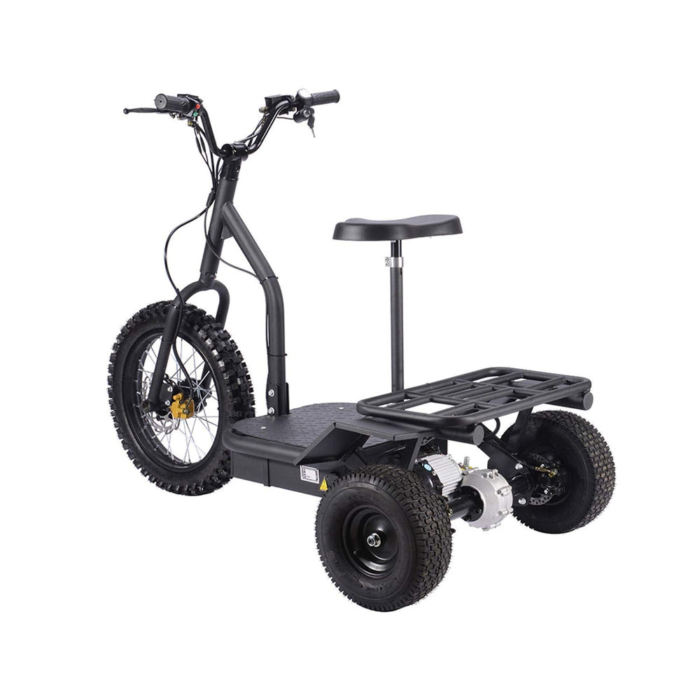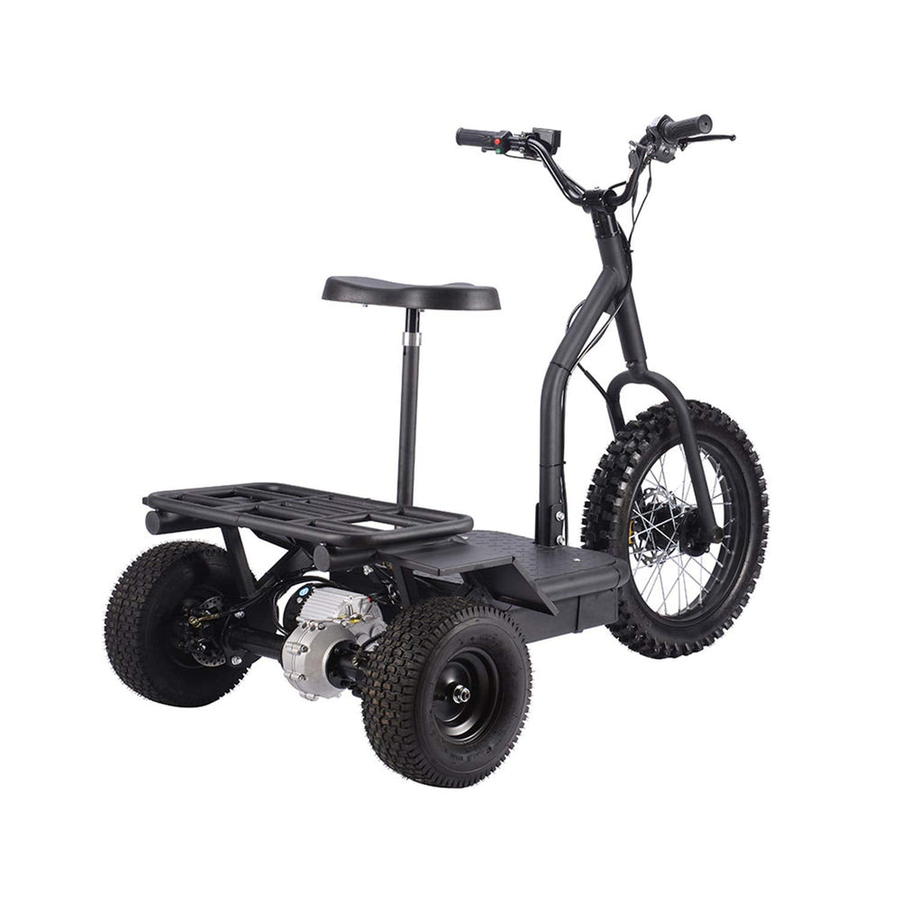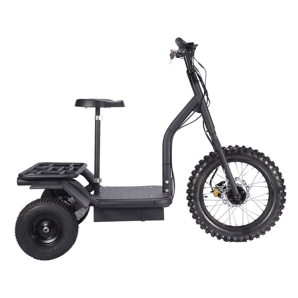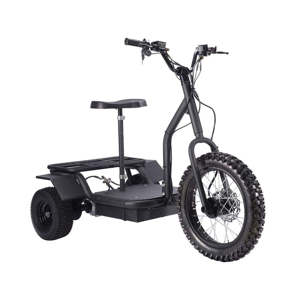 The New MotoTec 48v 1200w Electric Powered Trike is a torque monster ready to conquer any terrain! This is a three wheel electric scooter that you can ride while sitting or standing, this makes it very convenient for use at events, security and warehouse floor operations or for just plain fun! It's like a three wheel Segway but at a fraction of the price! Powered by a 1200 watt servo motor with speeds up to 15 miles per hour. It can achieve a 20 mile range on a full charge. It features a 24" pneumatic front tire, two 5" pneumatic rear tires and a removable seat. This personal transporter is easy-to-operate with a twist throttle and front/rear hydraulic brake system. Comes standard with key, battery meter lights, reverse and carrying rack. Specs: Motor power: 1200 Watt Servo Motor Transmission: Differential Gearbox (no chains or belts) Battery: Eight 12v 12ah Batteries (48v 24ah Total) Max Weight Capacity: 400 Lbs. Recommened Age: 13 and up Charger Included Brakes: Front/Rear Hydraulic Battery life: Over 300 charges Rated Speed: 15 MPH (weight dependent) Range per charge: 20 Miles (weight dependent) Recharge time: 4-8hrs Seat: Wide Saddle Front Wheel Diameter: 24 inch air filled tire Rear Tires Diameter: 12 inch air filled tires (13x5.00-6) Seat Height: 32in Min - 37in Max Scooter Weight: 216 lbs Scooter Dimensions: 62x34x46 inches Shipping Carton Size: 38x37x28 inches Shipping Weight: 255 lbs Ground Clearance: 6 inches Warranty: 30 days parts replacement