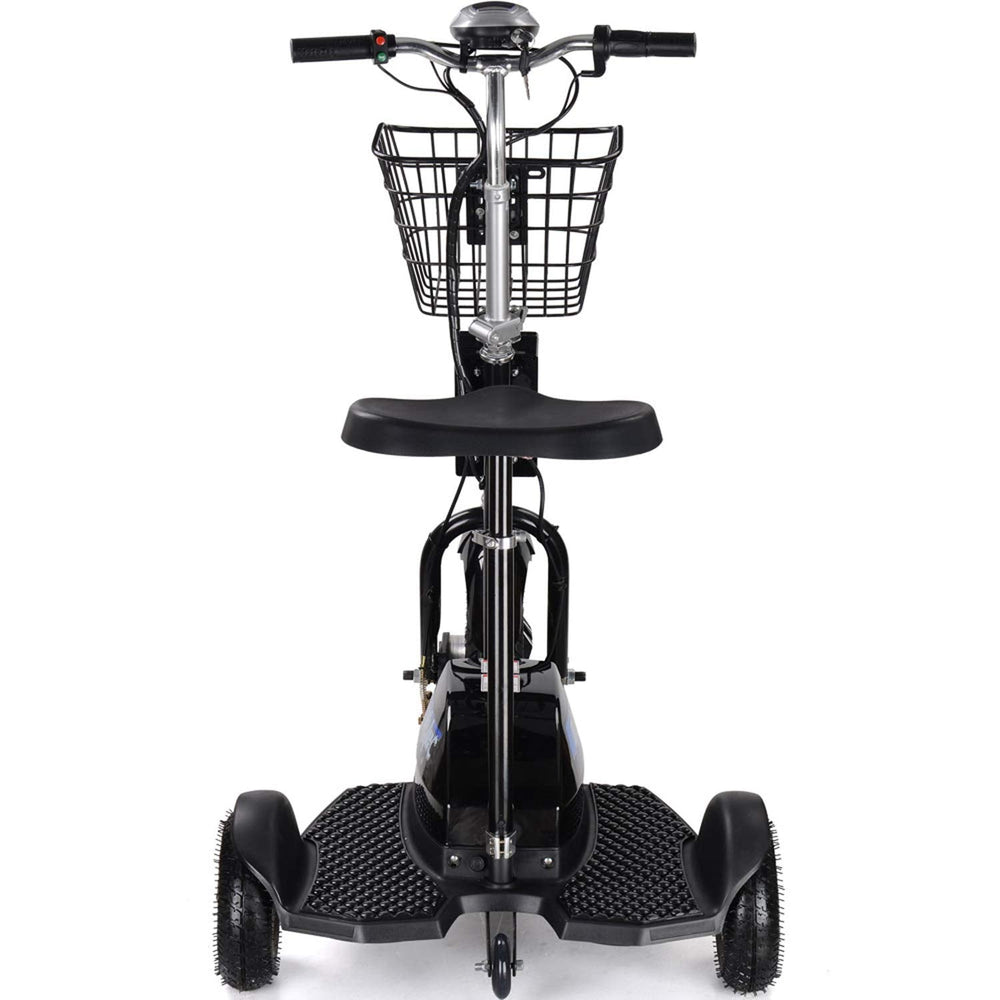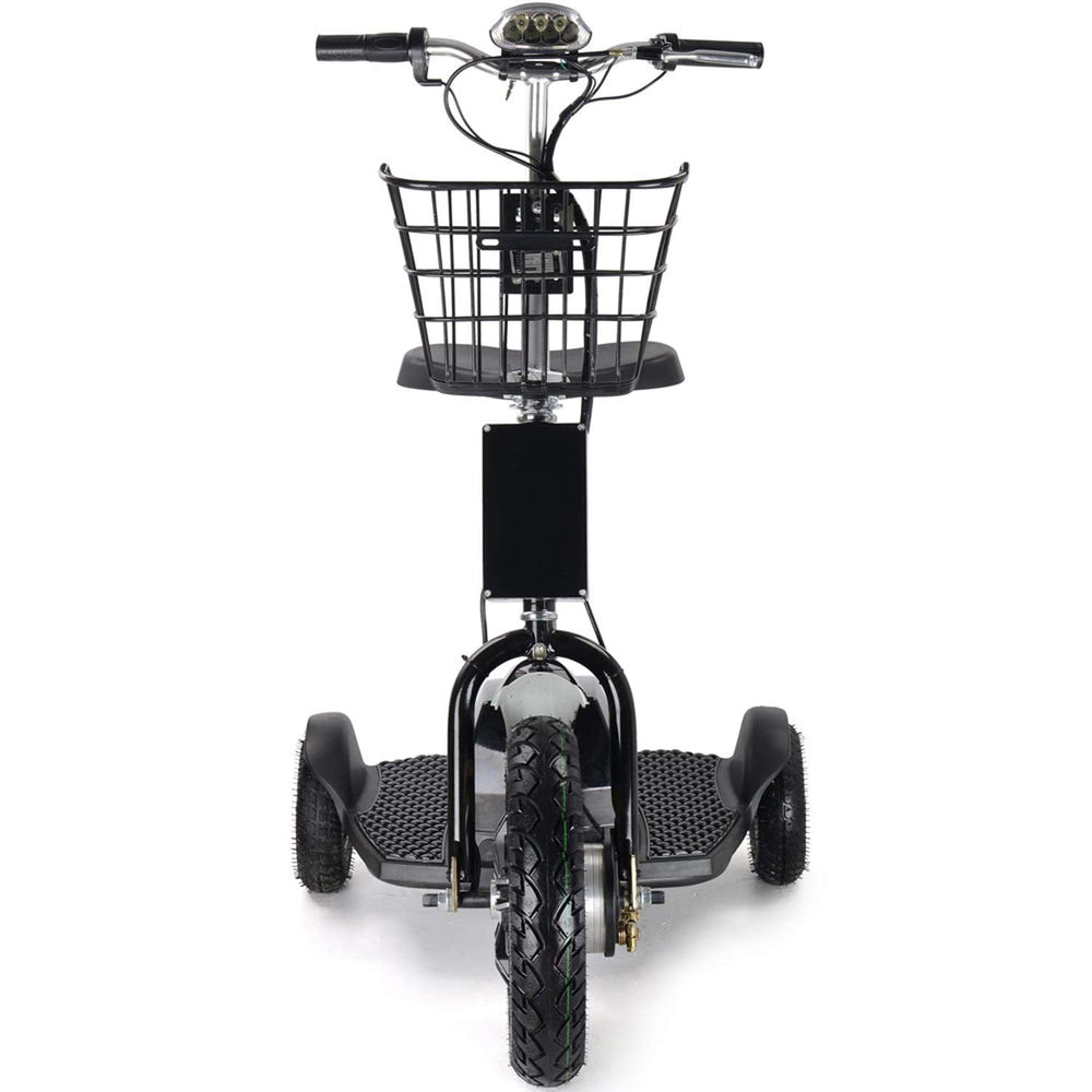 The MotoTec electric powered trike aka personal transporter is a three wheel electric scooter that you can ride while sitting or standing, This makes it very convenient for use at events, security and warehouse floor operations or for just plain fun! It's like a three wheel Segway but at a fraction of the price! Powered by a 500 watt front wheel hub motor with speeds of 22 miles per hour. It can achieve a 20 plus mile range on a full charge. It features a 16" Pneumatic front tire, two 9" Pneumatic rear tires and a removable seat. This personal transporter is easy-to-operate with a twist throttle and left handle front drum brake system. Comes standard with key, battery meter light, front LED head light and carrying basket. Specs: motor power: 500 Watt brushless hub motor battery: four 12V 12Ah batteries (48V total) Max weight capacity: 240 lbs. Recommended age: 13 and up charger included Battery life: over 300 charges rated speed: 22 mph (weight dependent) range per charge: 20-25 miles* recharge time: 4-8hrs climbing ability: 10 degrees seat: wide saddle front wheel diameter: 16 inch air filled tires rear tires diameter: 2. 80/2. 50-4 inch air filled tires (9 inch tall) shipping weight: 100 lbs. shipping carton size: 34x32x20 inches scooter weight: 93 lbs. scooter dimensions: Length: 41 inches, Width: 28 inches, height: 50 inches ground clearance: 2 inches