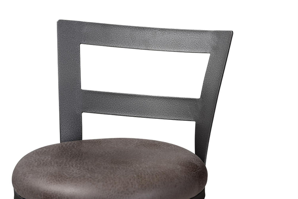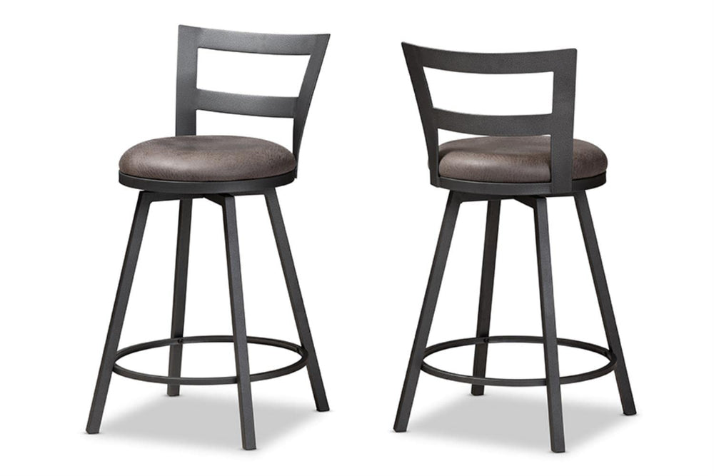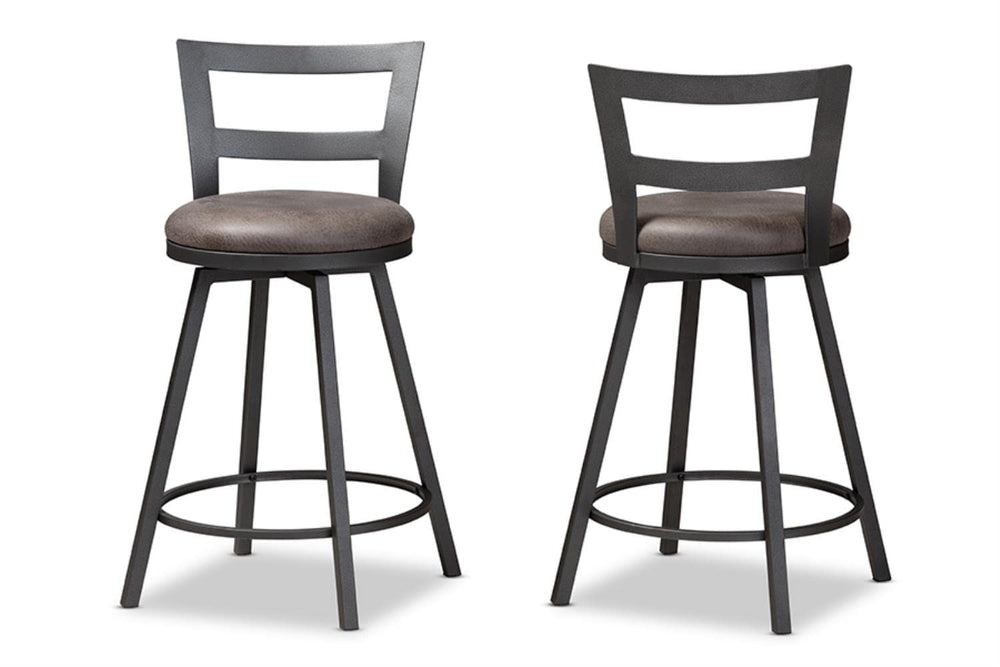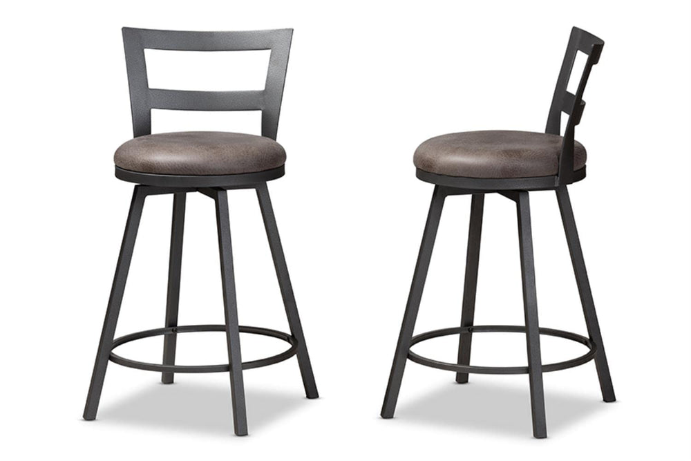 Add lasting style and charm to your space with the Arjean pub stool. The minimalist silhouette and neutral colorings are indicative of the stool's rustic and industrial-inspired design. The Arjean's sturdy metal frame is finished in a matte antique silver. The pub stool features circular, grey faux leather upholstered seats with foam padding for hours of comfort. The chair back of the Arjean is an open work design, which is slightly curved and winged. These pub stools will look right at home in your dining room, kitchen, or breakfast nook. Made in China, the Arjean requires assembly.