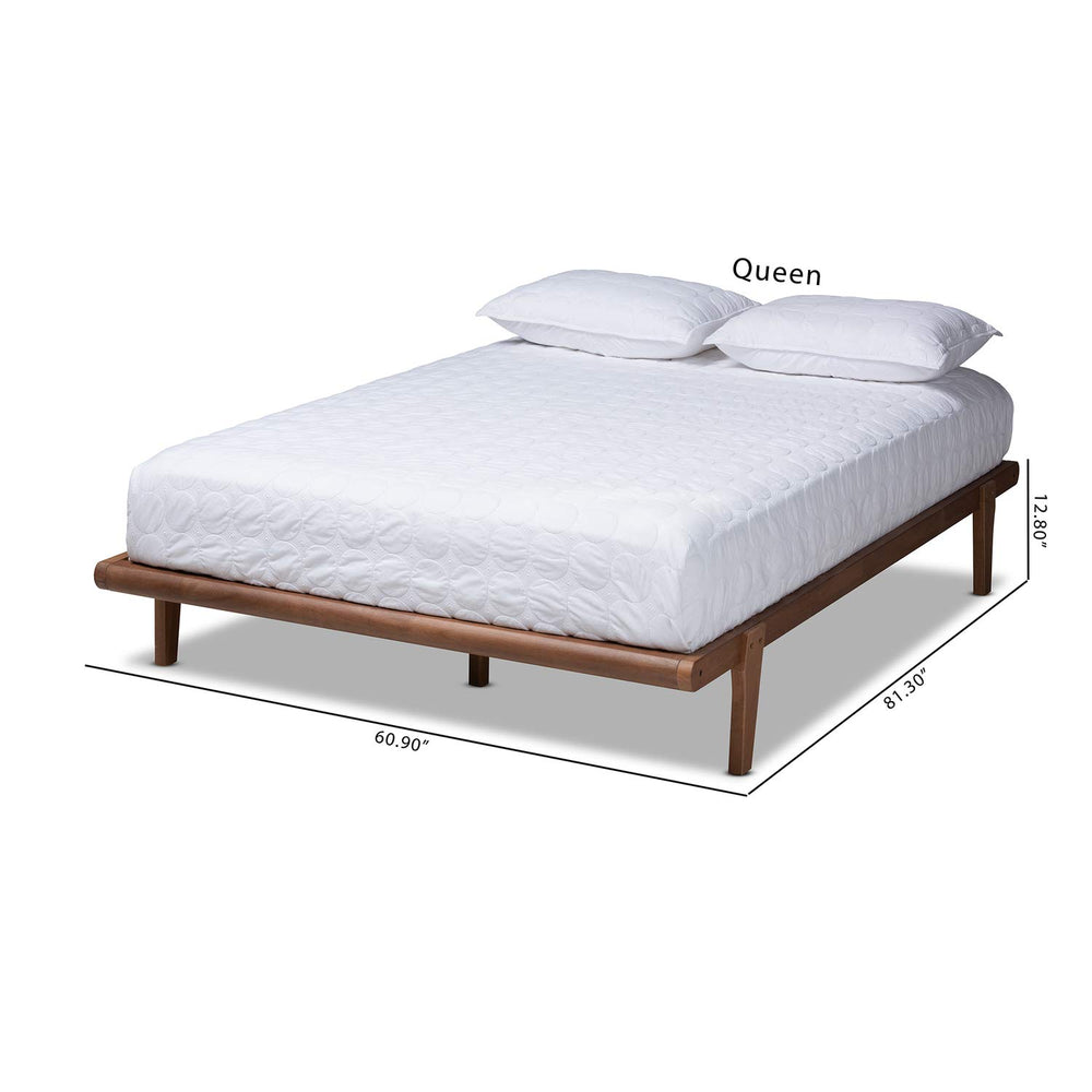 Create a relaxed, casual retreat in your bedroom with the Kaia bed frame. Crafted from solid rubberwood, the Kaia features a classic walnut brown finish that complements any color palette. Its low platform and angled, tapered legs are reminiscent of cool, mid-century modern design. Add some crisp white sheets and a plush duvet to complete the look. This bed includes wood slats, which eliminate the need for a box spring. The Kaia bed frame is made in Malaysia and requires assembly.Dimensions: 12.8" High x 56.7" Wide x 76.2" Deep; Slats: 2.5" Wide x 53.9" Long x 0.6" Thick; Top of Slat: 11.8" High; Legs: 10.1" High; Inside Dimensions (Mattress Size): 54" Wide x 74" Deep